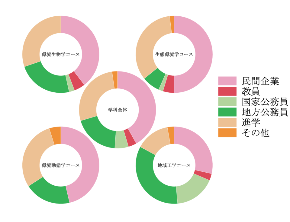 これまで,環境共生科学科全体での進学・就職状況について見てきましたが,環境共生科学科には4つの教育コースがあり,それぞれが特色のある教育を行っています.この教育コース毎に卒業生の進路を見てみると,以下の図になります.いずれのコースでも民間企業,公務員,進学が主な進路となっていますが,コース毎に進路の特色が異なります.