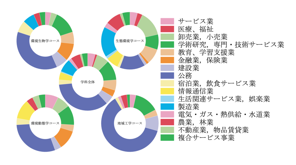 環境生物学コースでは,都道府県庁専門職員などへ就職する卒業生に該当する「公務」の業種の割合が高くなっています.また,専門知識を活かした就職先として,「学術研究,専門・技術サービス業」(環境調査会社など)の割合も高くなっています.