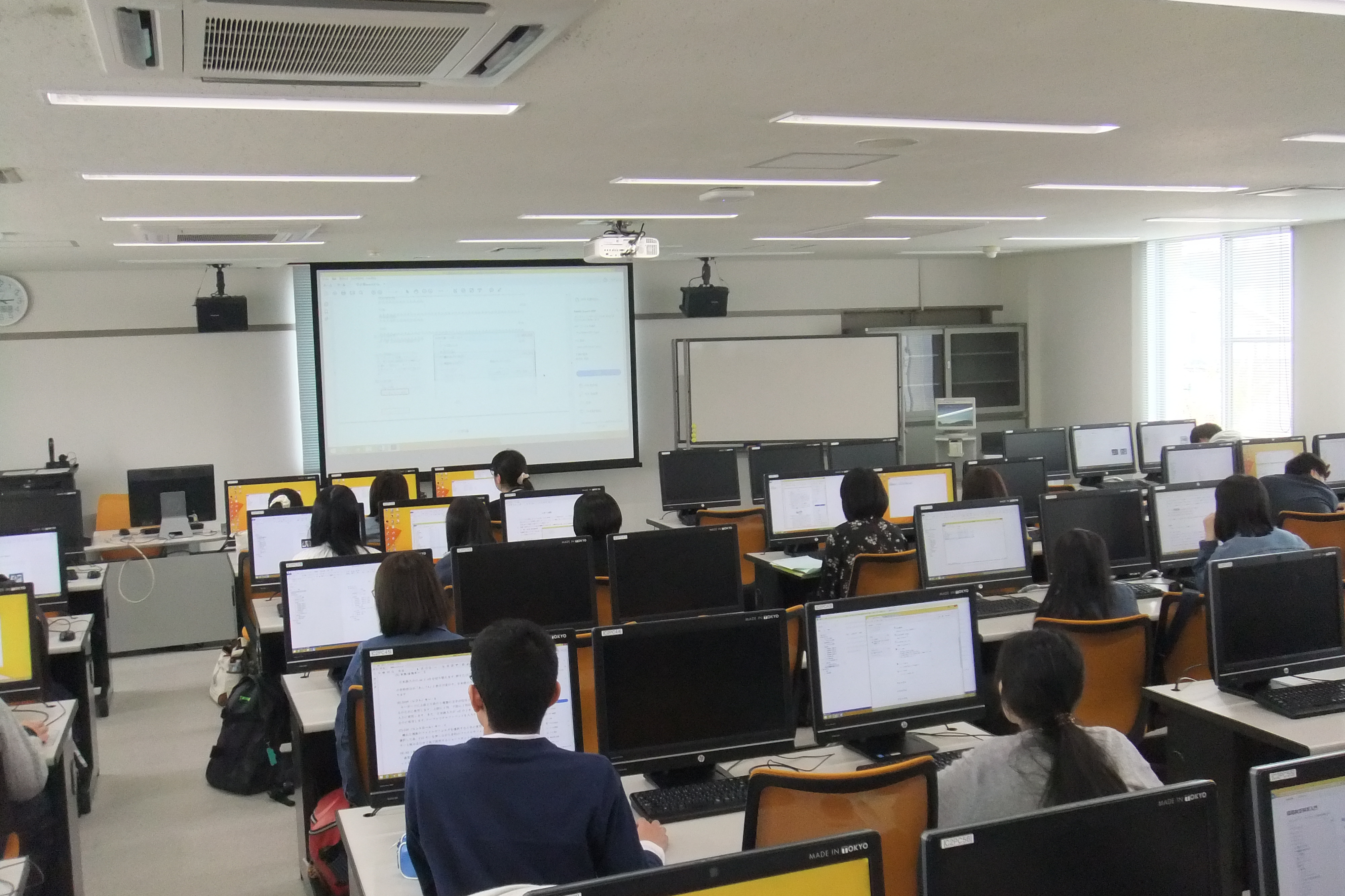 ひとり1台のパソコンを使って、Wordの基本的な使用法だけでなく、覚えておくと便利な機能について学びました。実習は、2部屋に分かれて、遠隔授業で行われました。