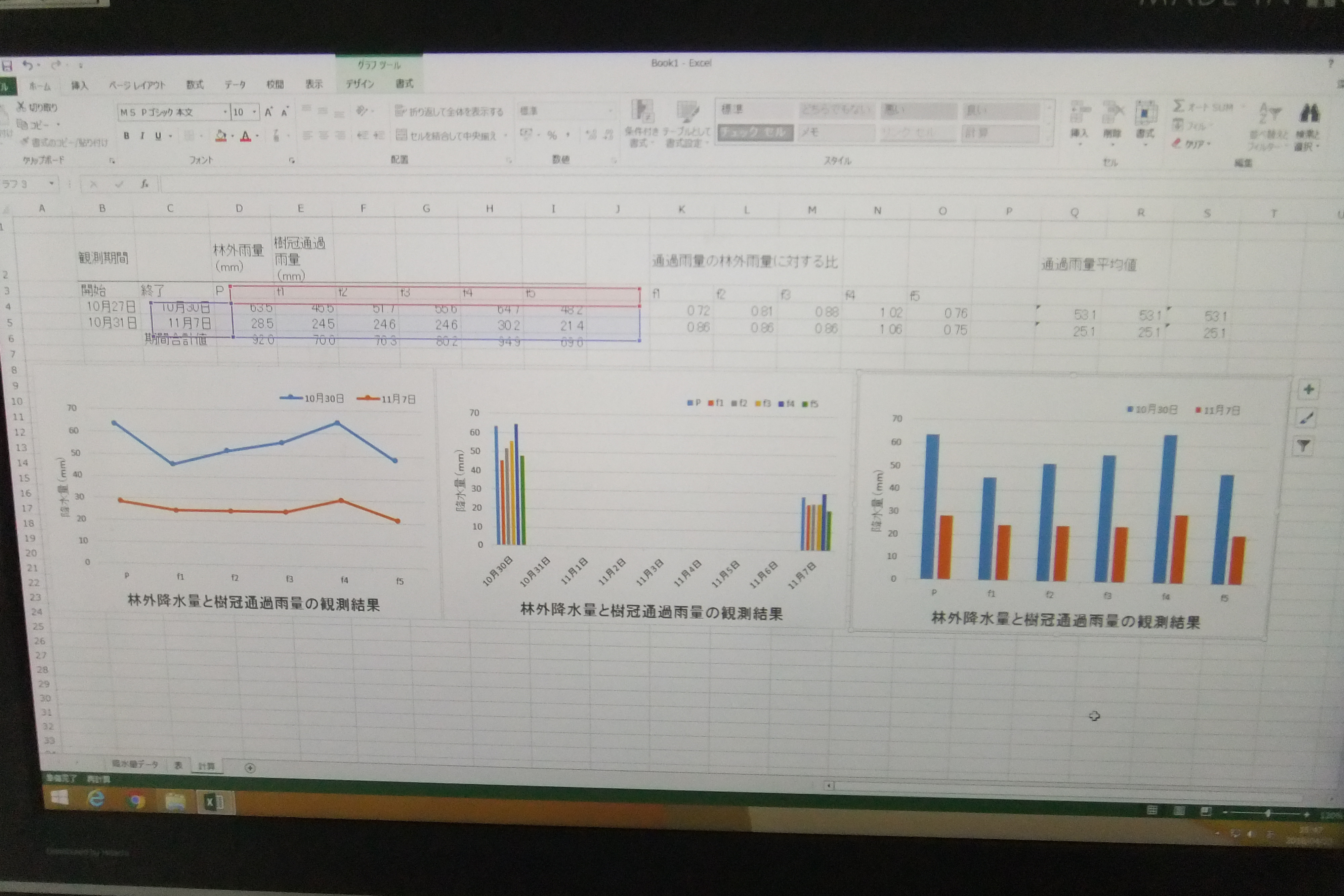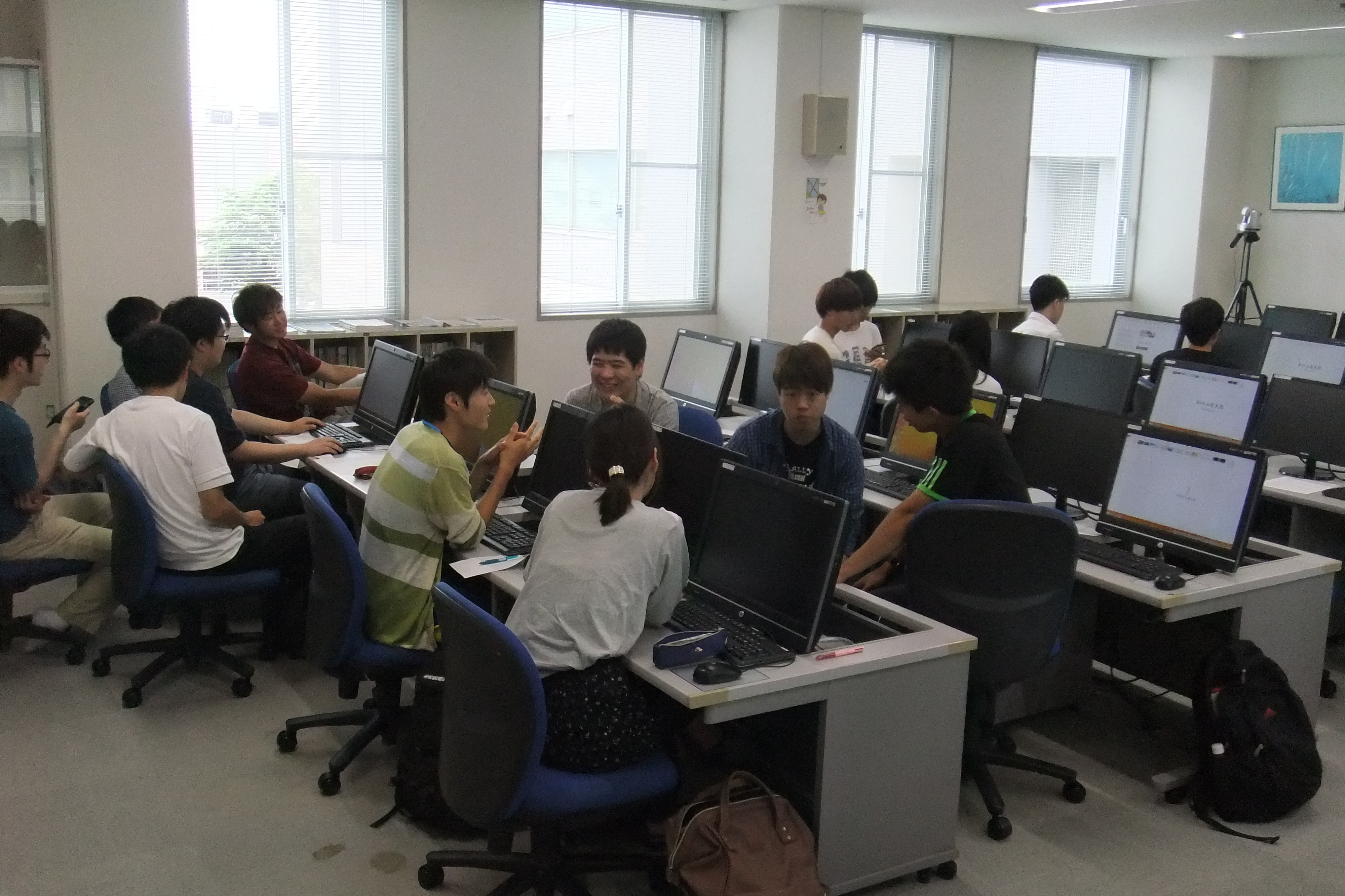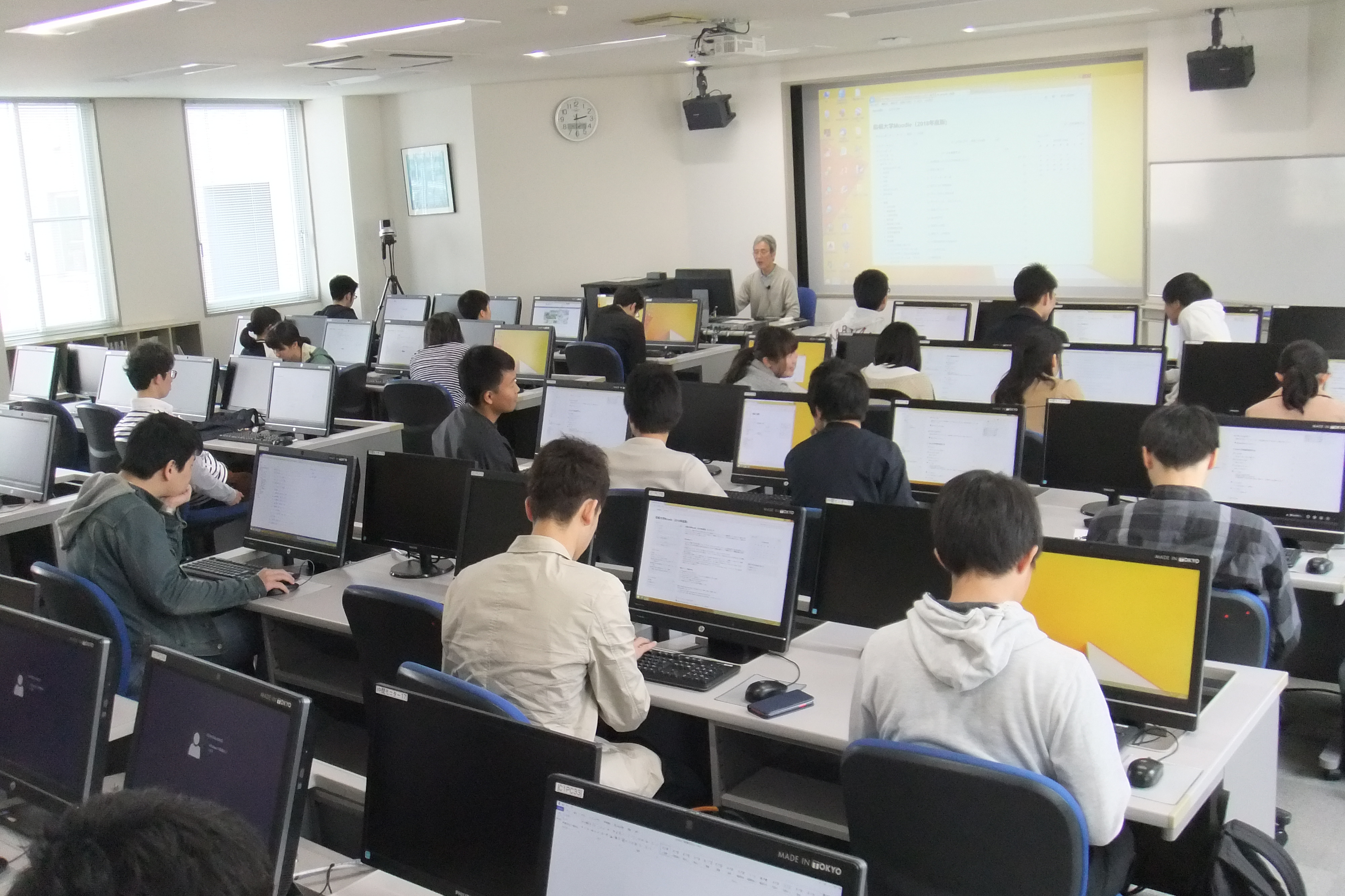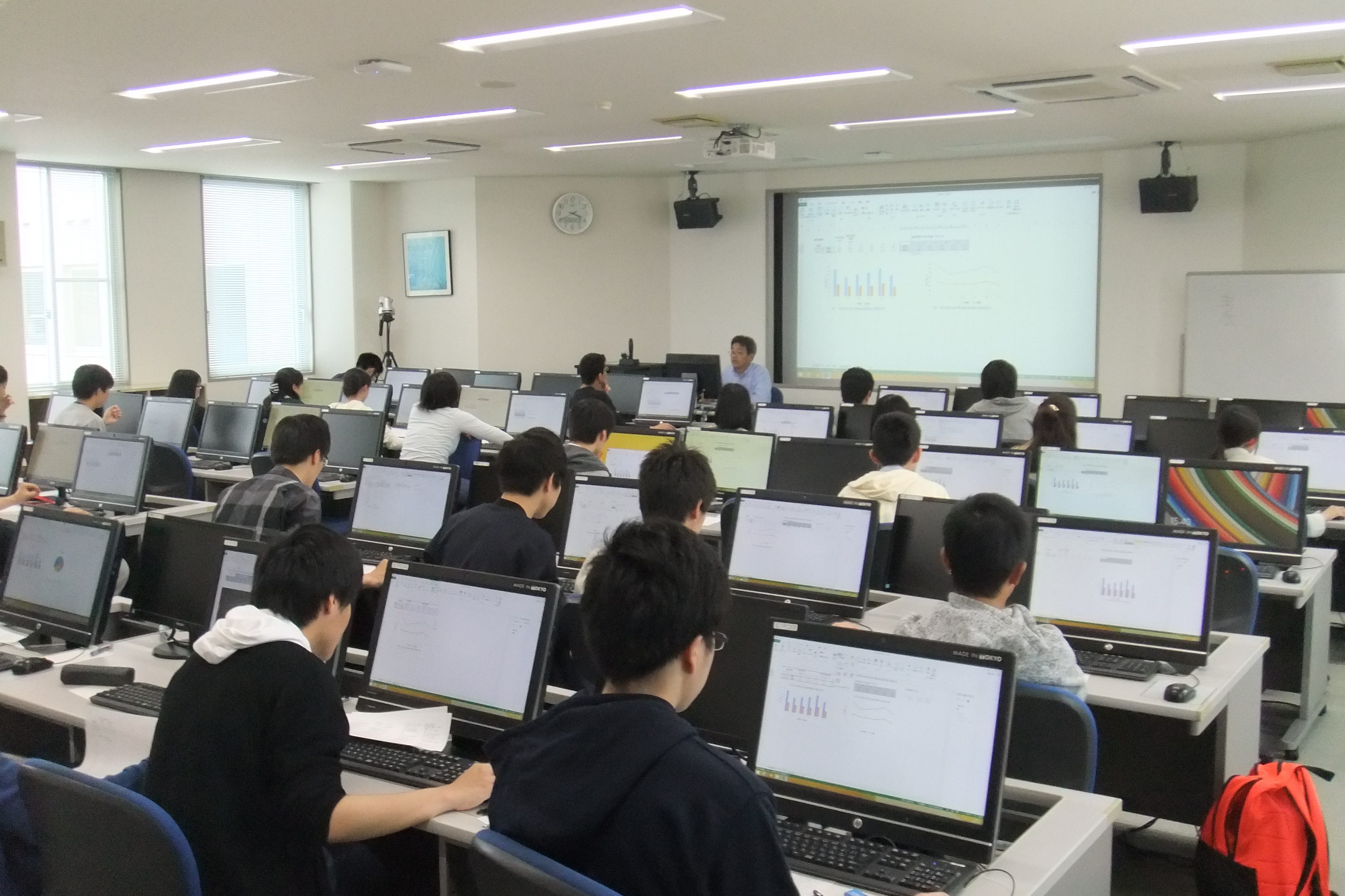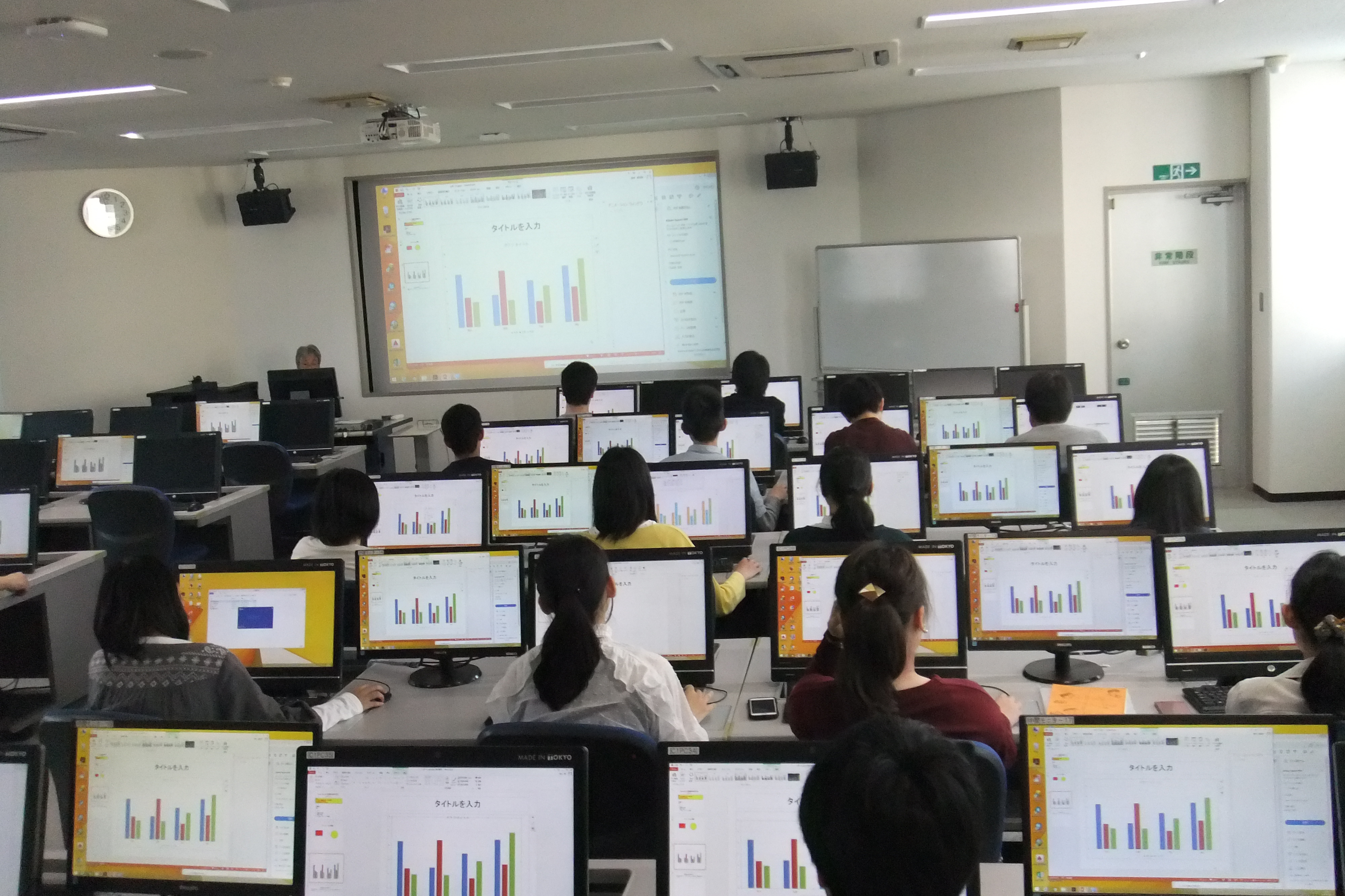 ひとり1台のパソコンを使って、データの入力、表の作成、関数を用いた平均の出し方、グラフの作成など、Excelの基本的な使用法を学びました。実習は、2部屋に分かれて、2名の教員により行われました。