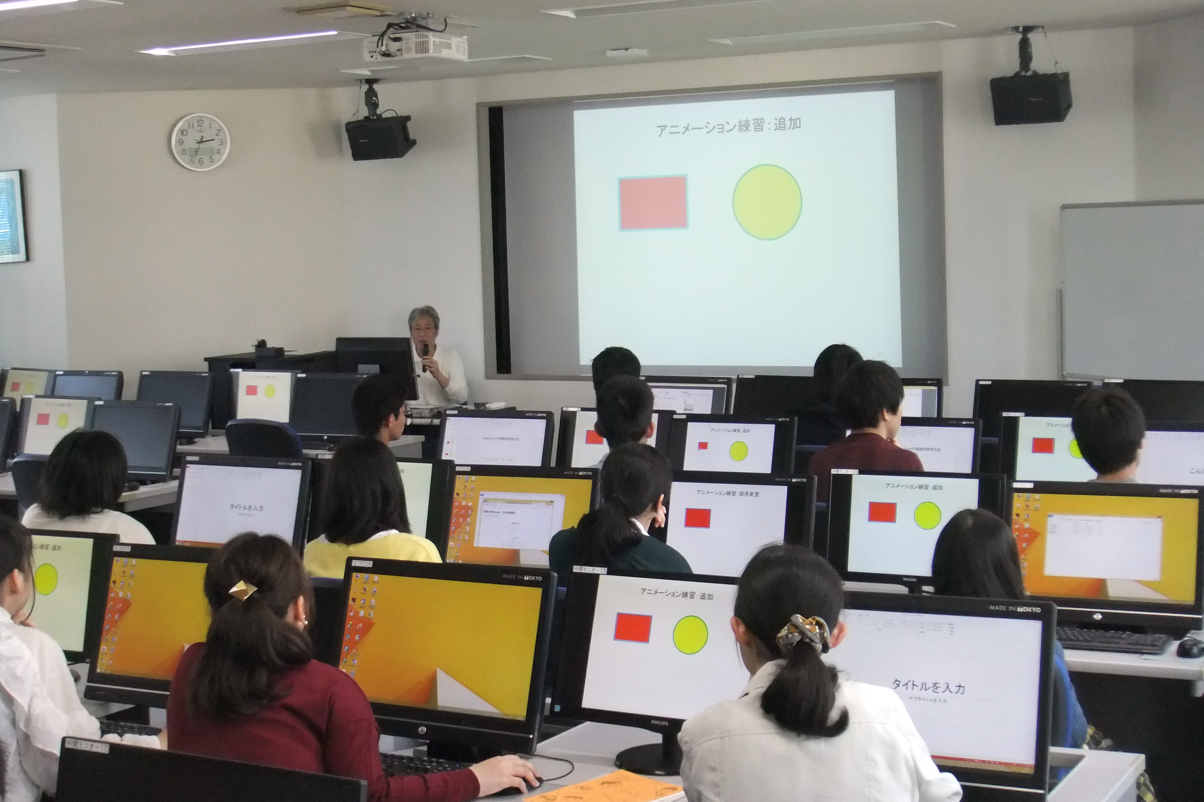ひとり1台のパソコンを使って、アニメーション機能、エクセルデータからの図表の作成と編集など、PowerPointの実践方法的の一部を学びました。実習は、2部屋に分かれて、1名の教員により遠隔授業で行われました。