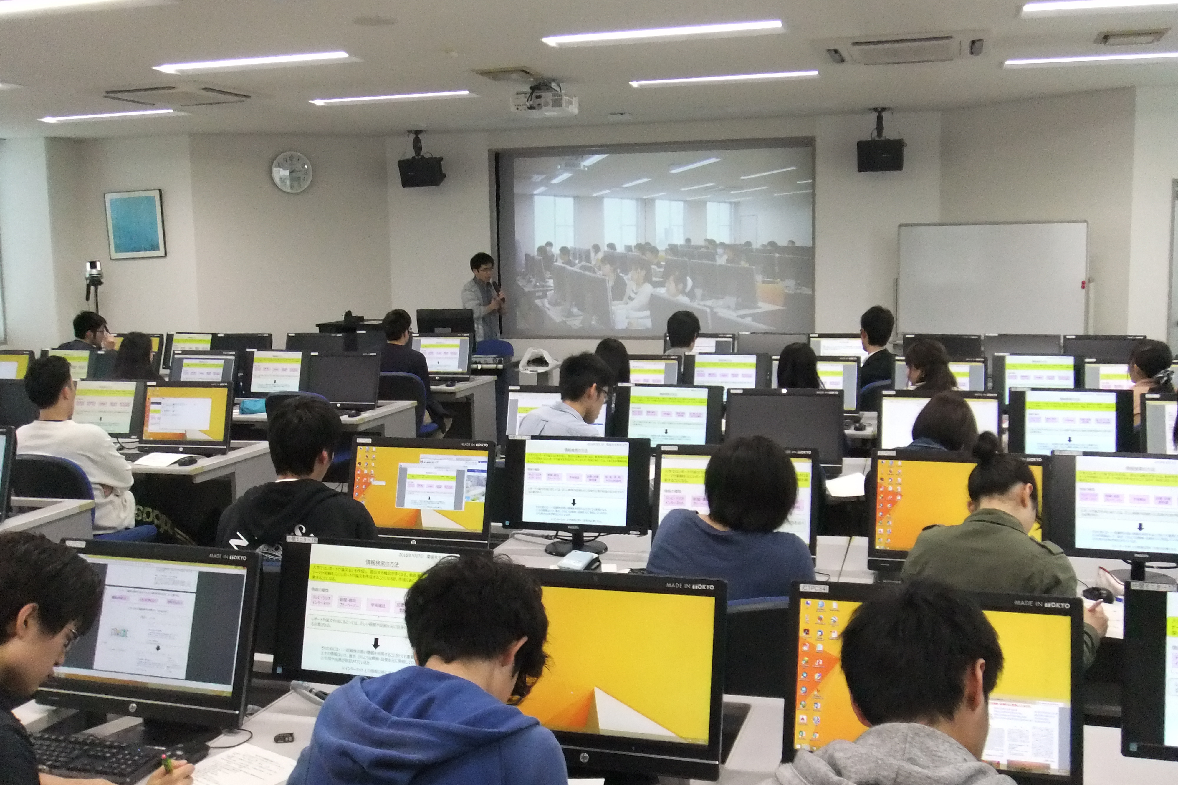 実習は2部屋に分かれて、遠隔授業で行われました。教員やTAのサポートを受けながら、日本語や英語の情報(文献)検索を実際に行ない、情報検索の基礎を学びました。