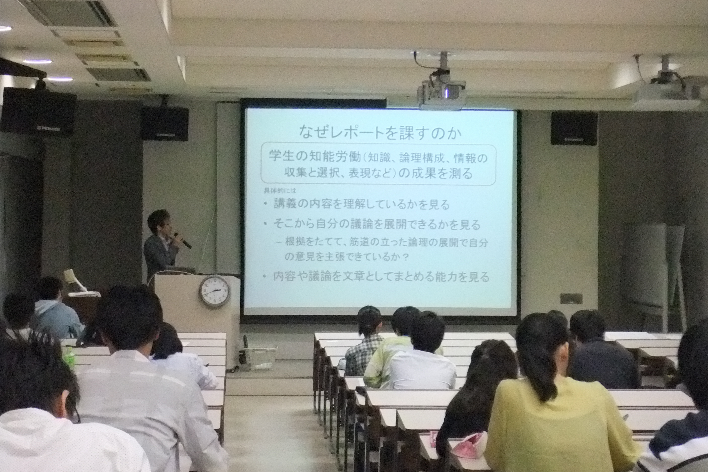 2回目は、良いレポート・悪いレポートの例を見て、何が問題だったのかを学生自身が考え、教員がそれについてコメントしました。また、文章を分かりやすくするための工夫について学びました。