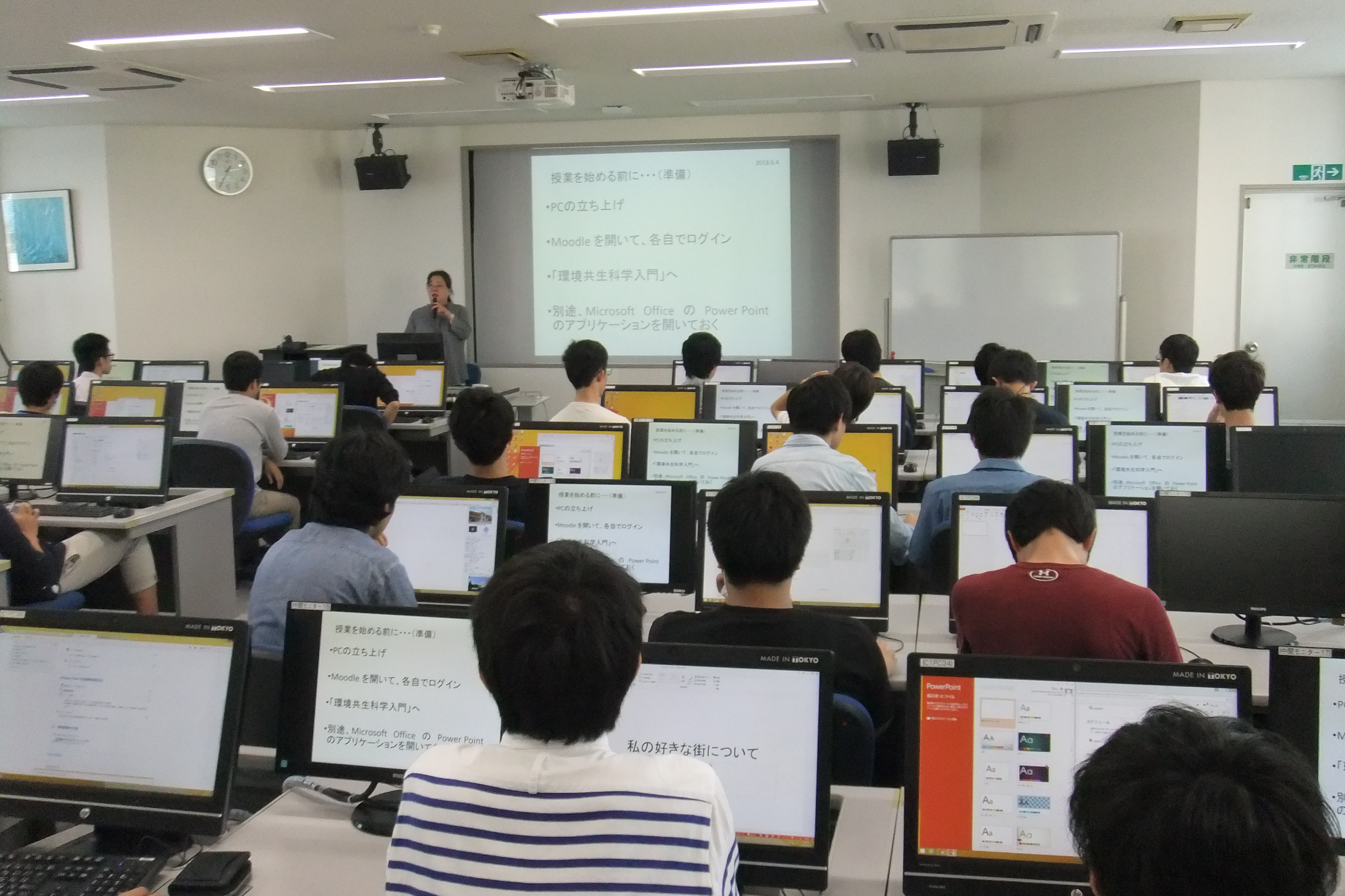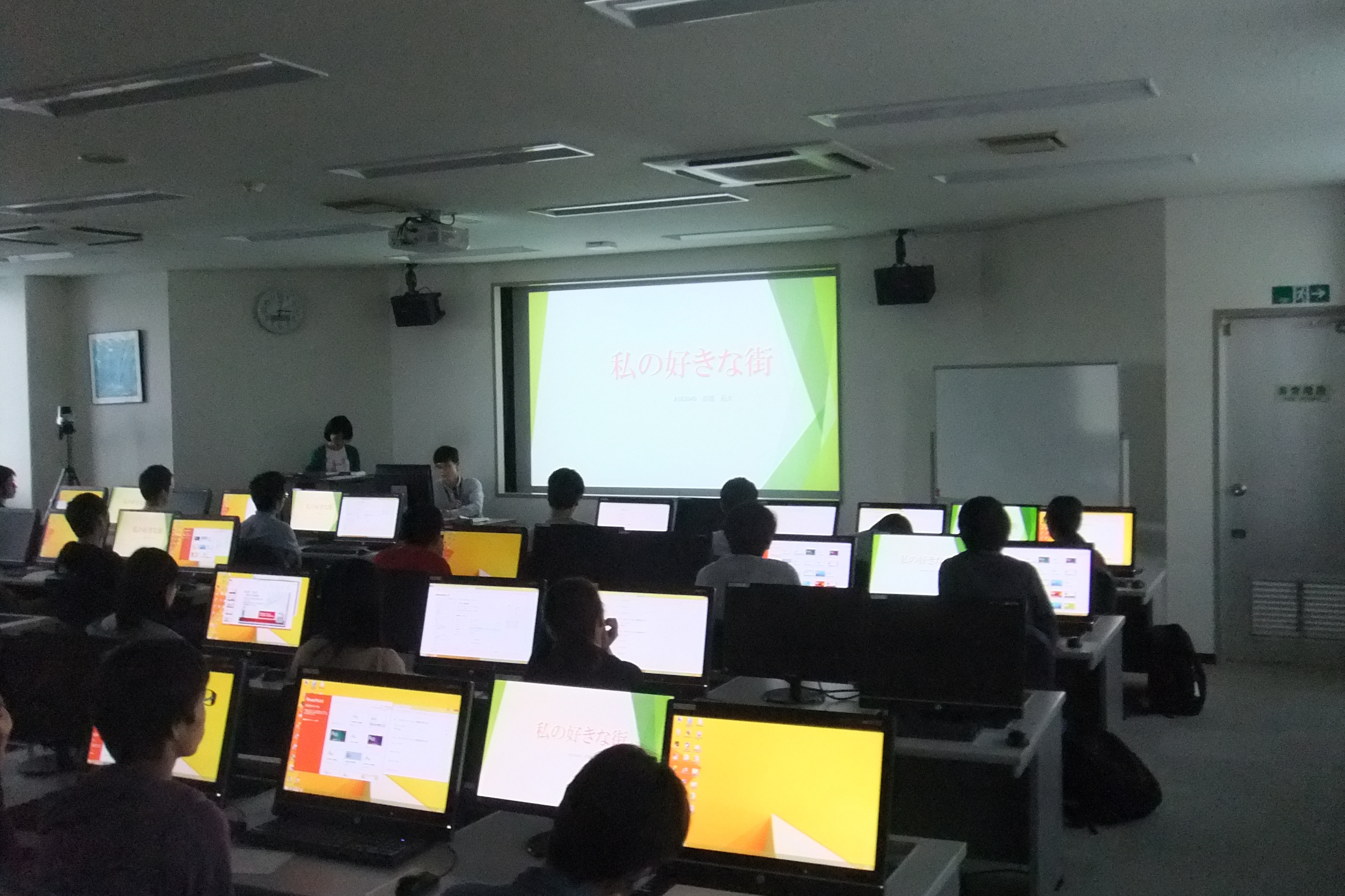 1回目の授業では、プレゼンテーション資料をパワーポイントで作成する上で、構成についての考え方や、相手に伝えるための心構えなどを学びました。そのあと、「自分の好きな街」という課題に対して、パワーポイントのスライド作成に一人一人が取り組みました。2回目の授業では、学生が作成したプレゼンテーション資料をいくつかピックアップし、実際に投影しながら講評を行ない、具体的な改善方法が解説されました。