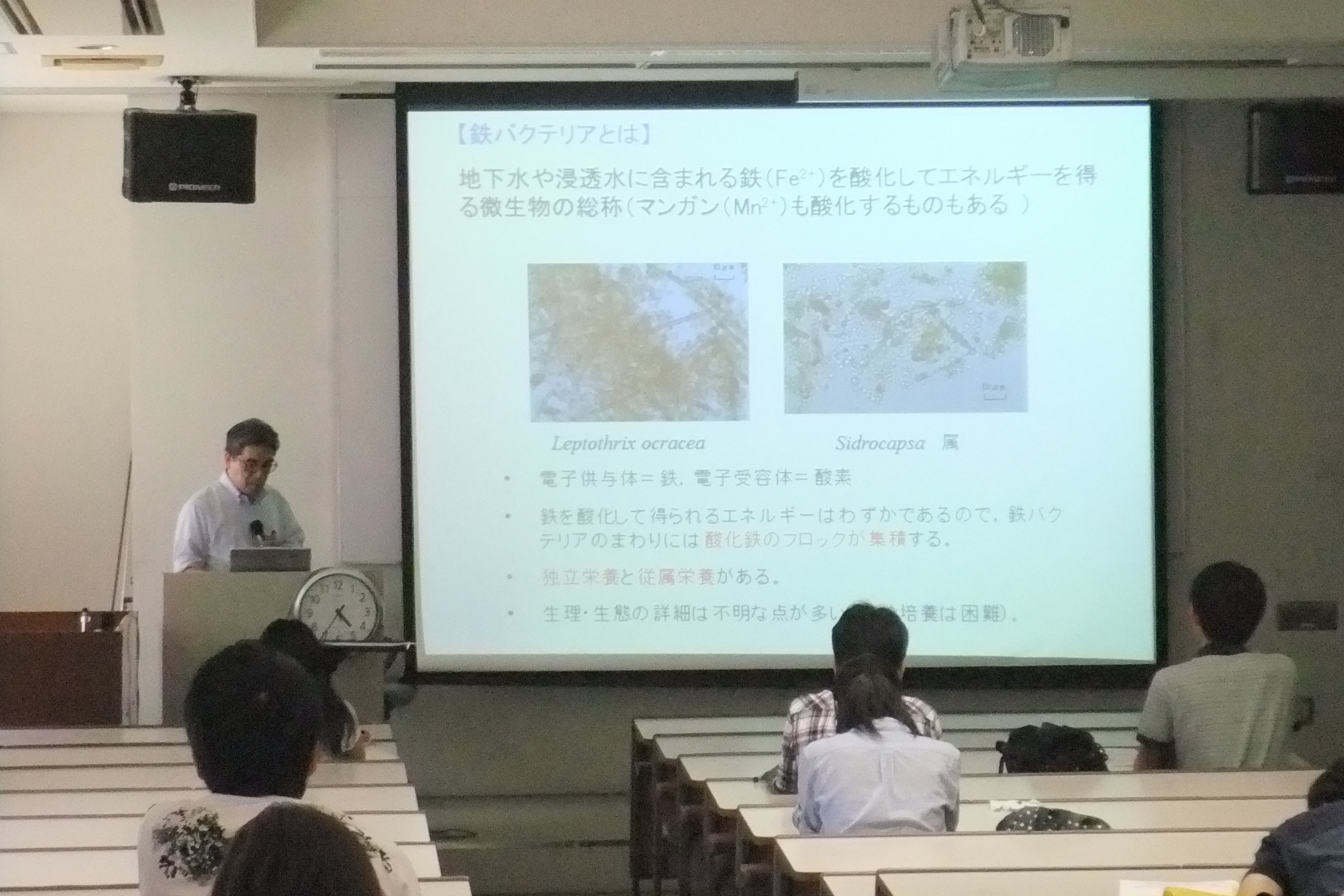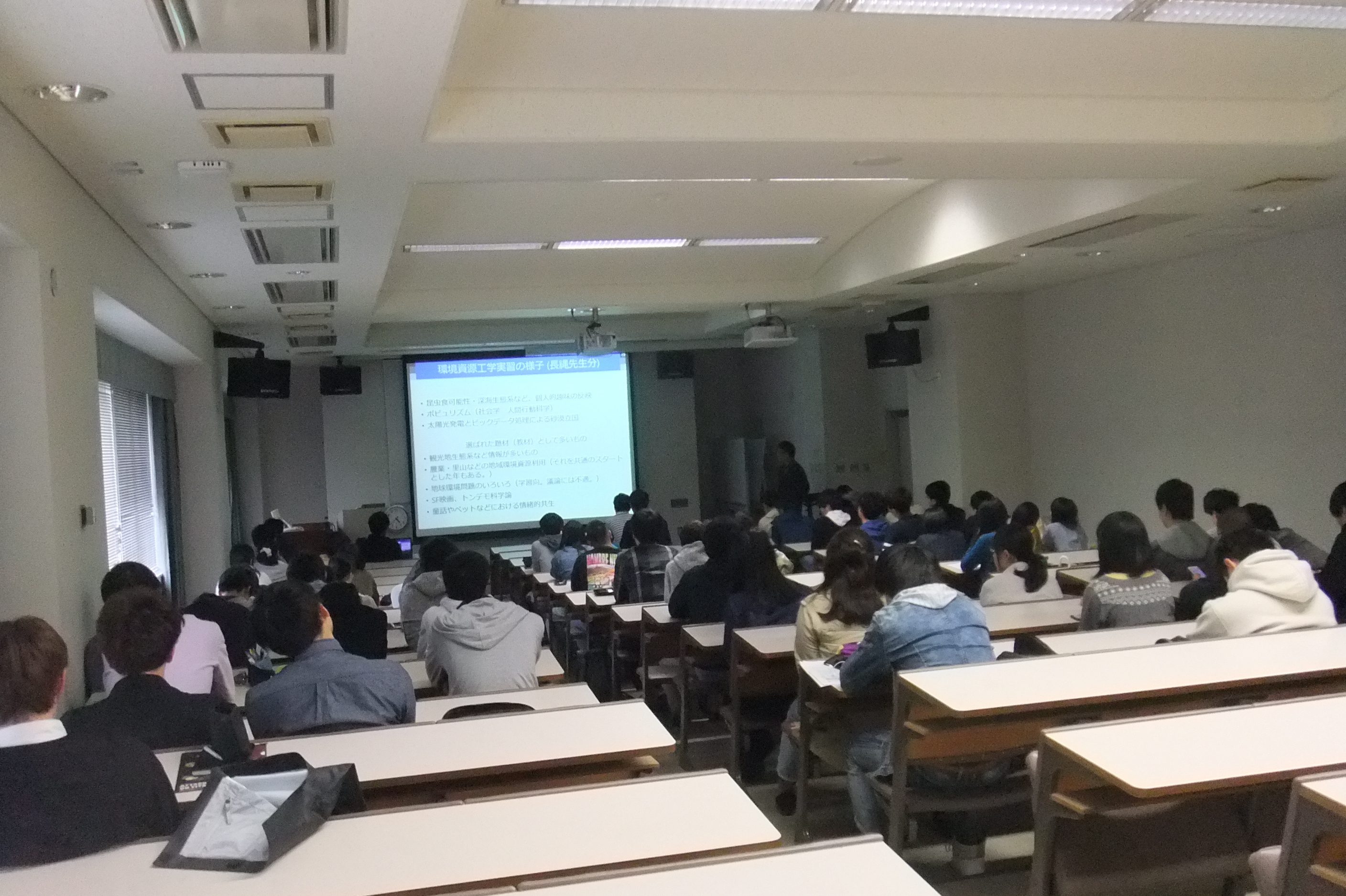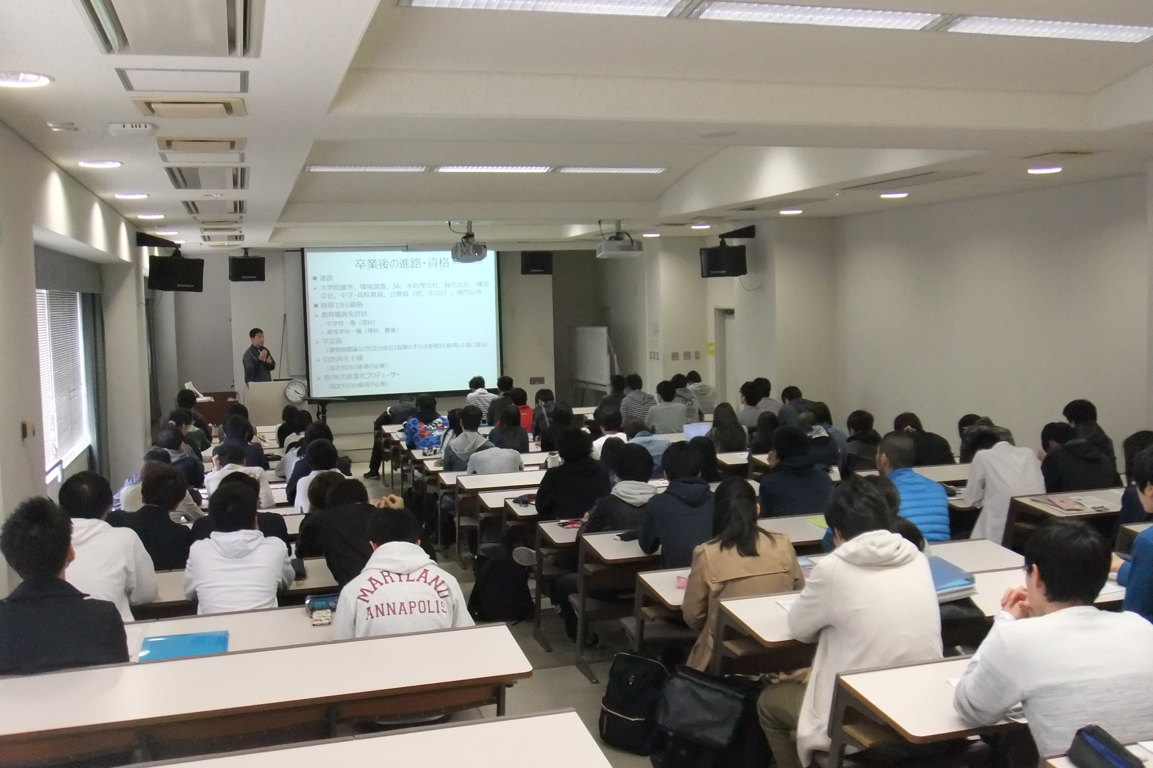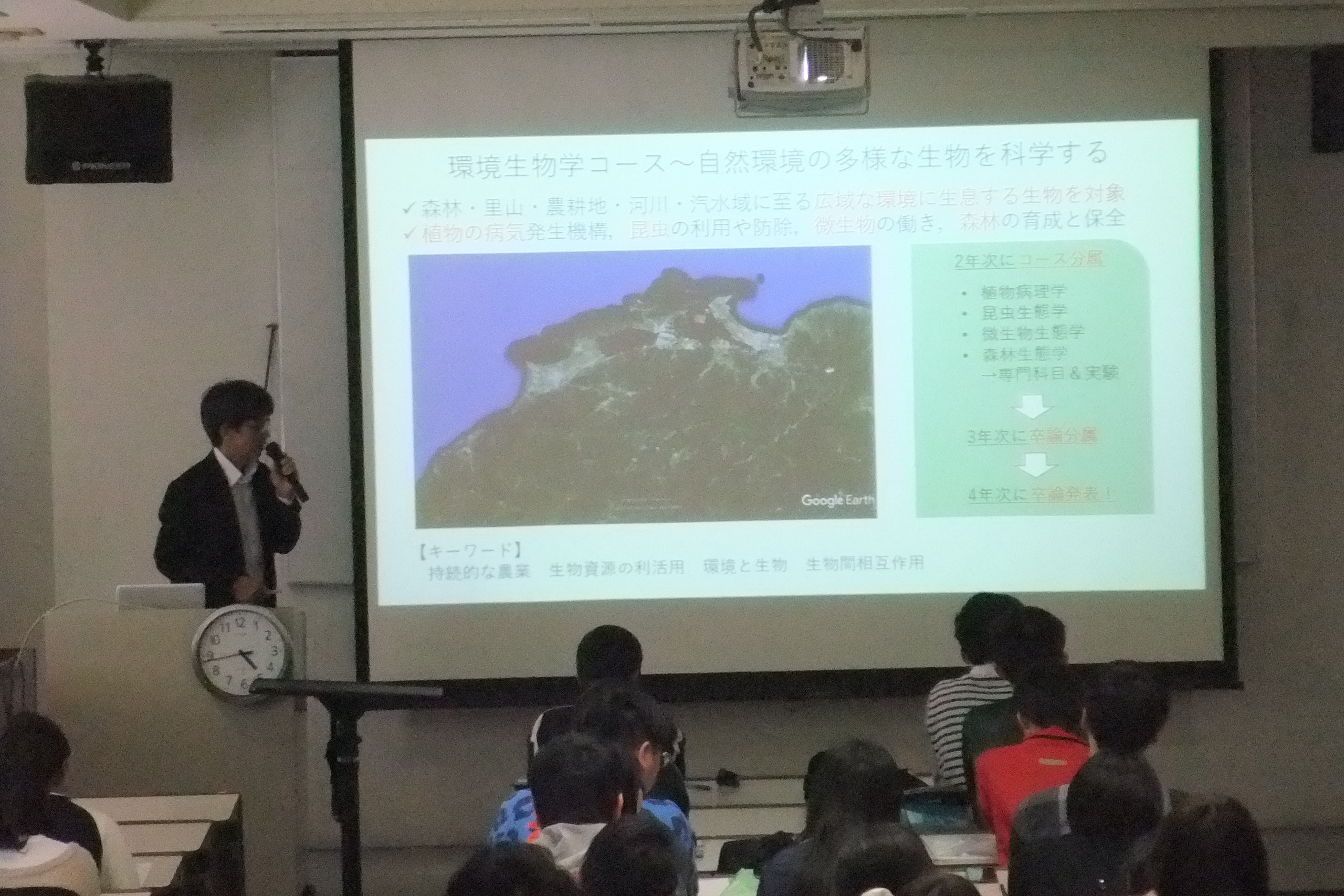 環境生物学コースと生態環境学コースのコース紹介がありました。それぞれのコースの特徴や授業科目、主な卒業論文のテーマについての説明がありました。最後の質問コーナーでは、学生が積極的に質問しました。