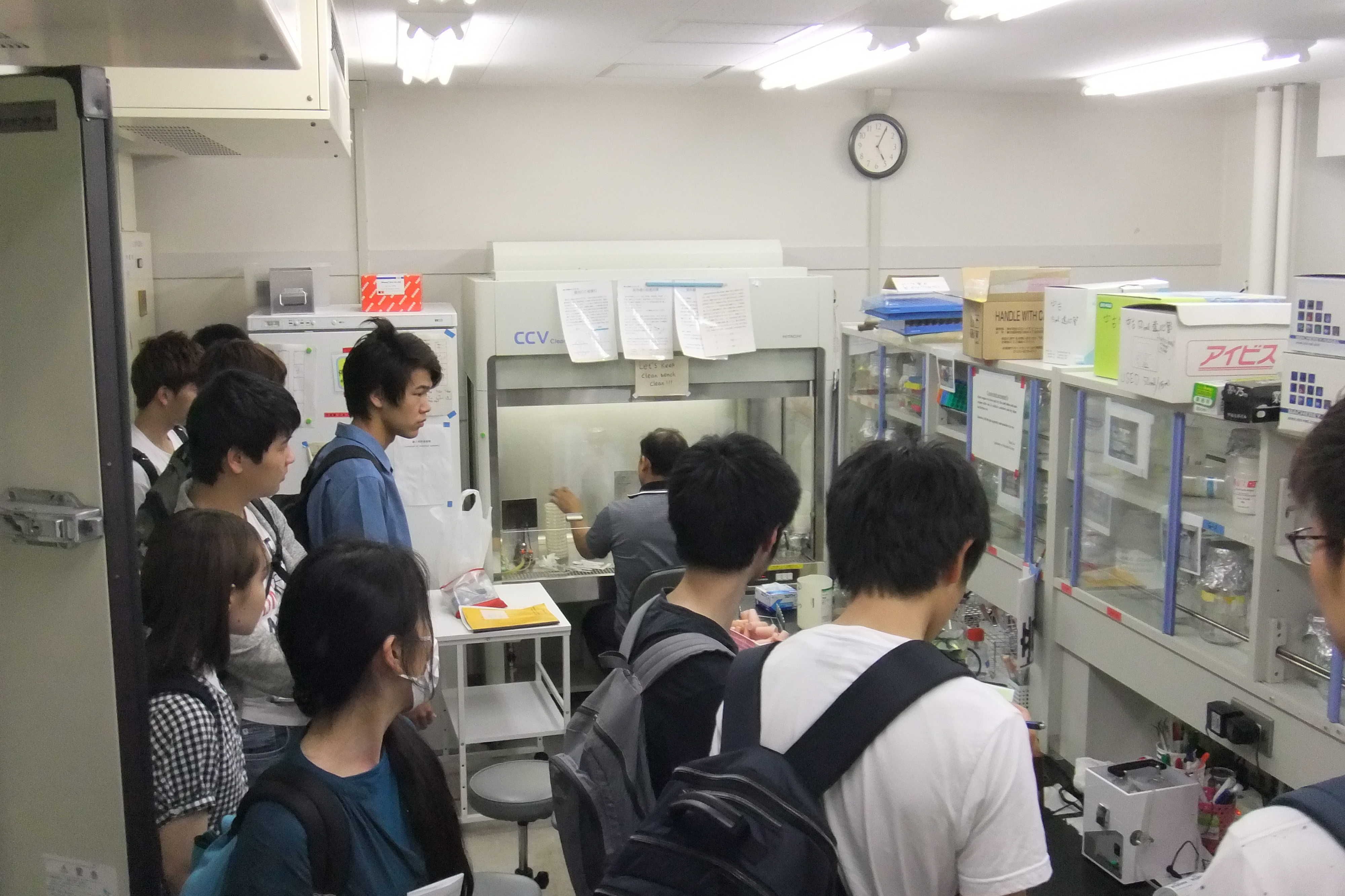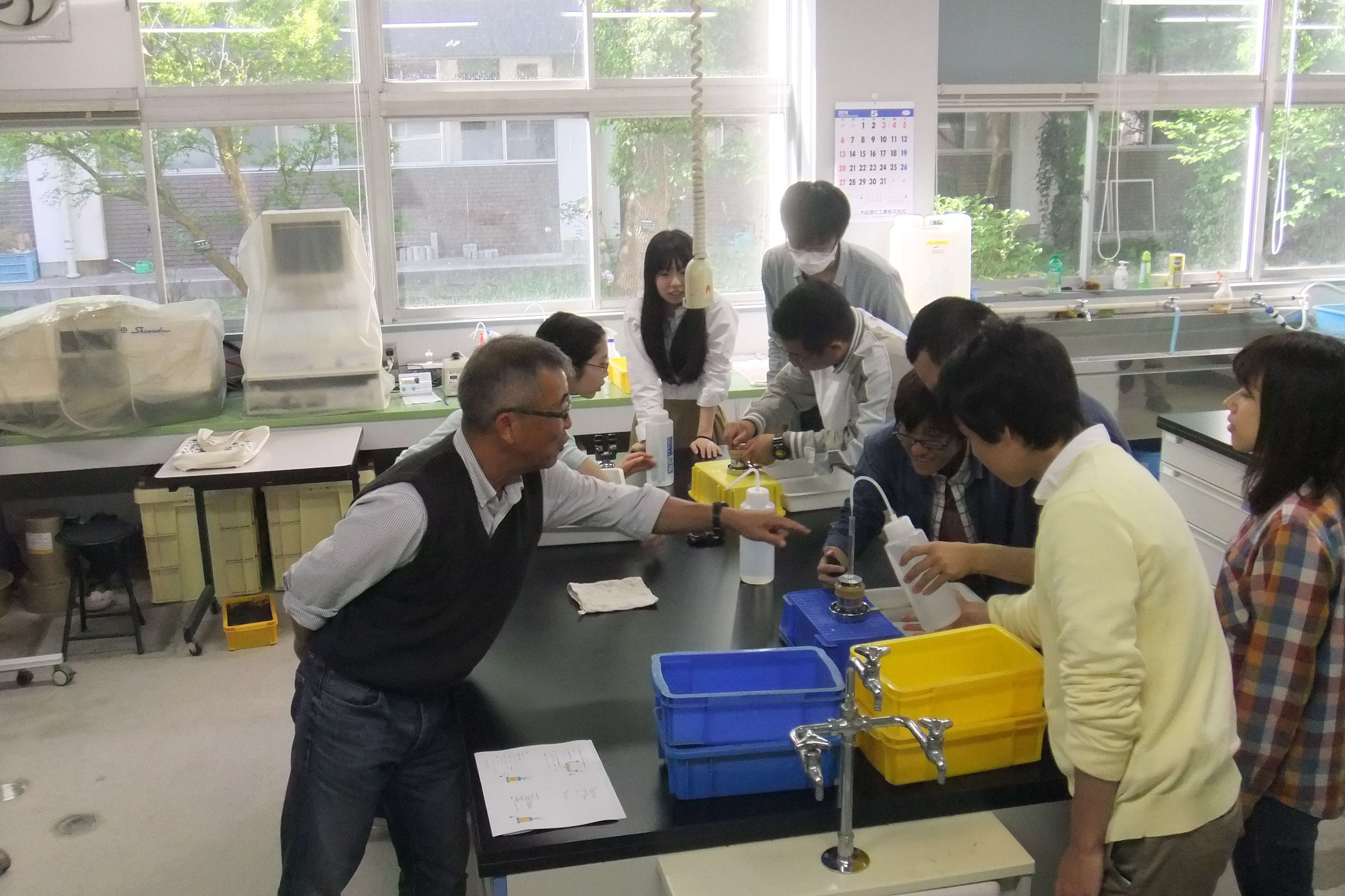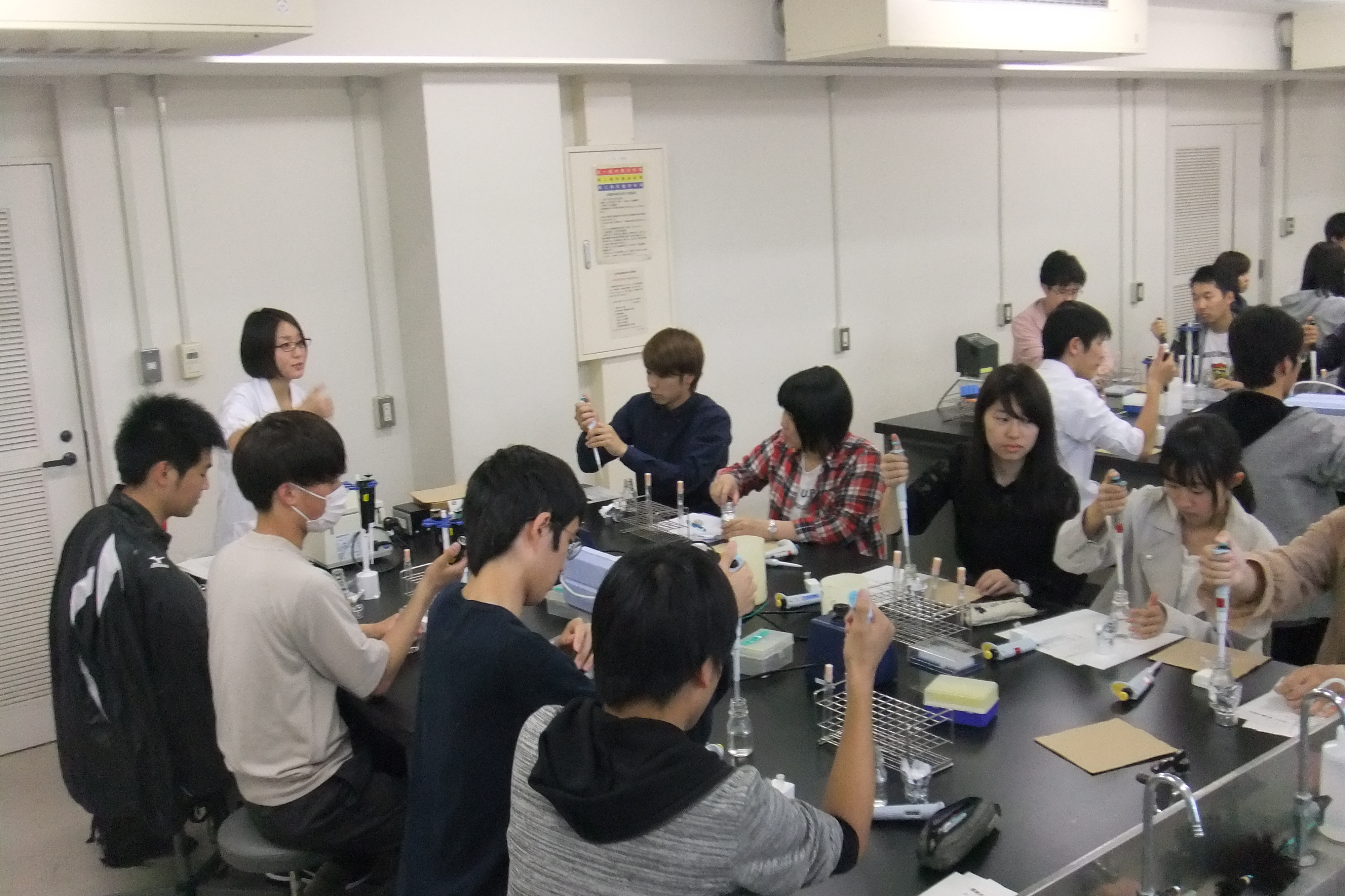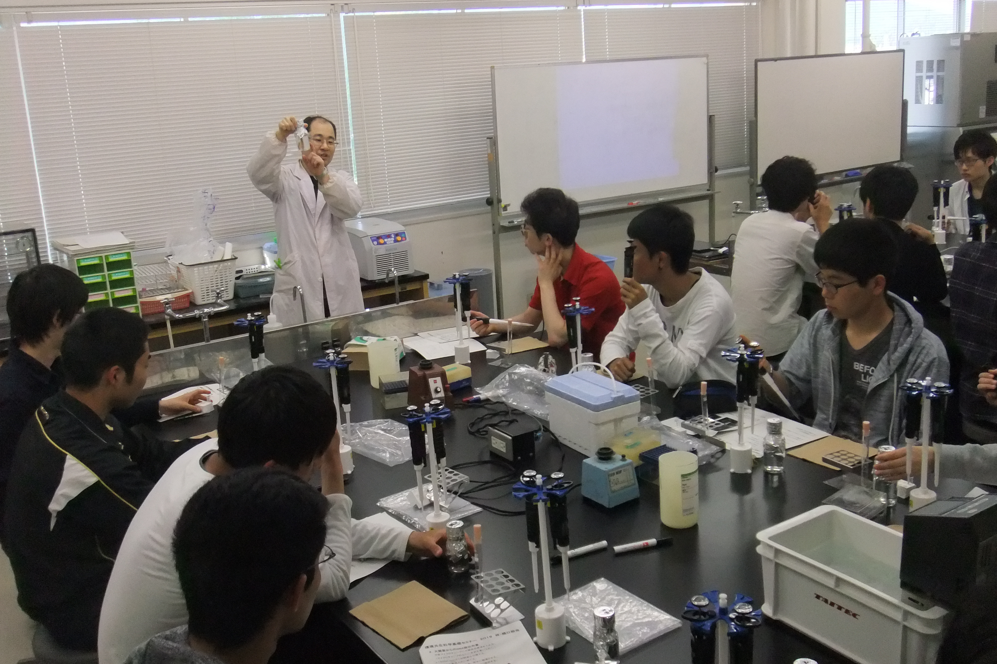 化学実験室で、ピペットマンの基本的な操作方法について学ぶとともに、大腸菌からDNAを抽出するための実験プロトコールにしたがって、一人ずつDNA抽出を行ないました。