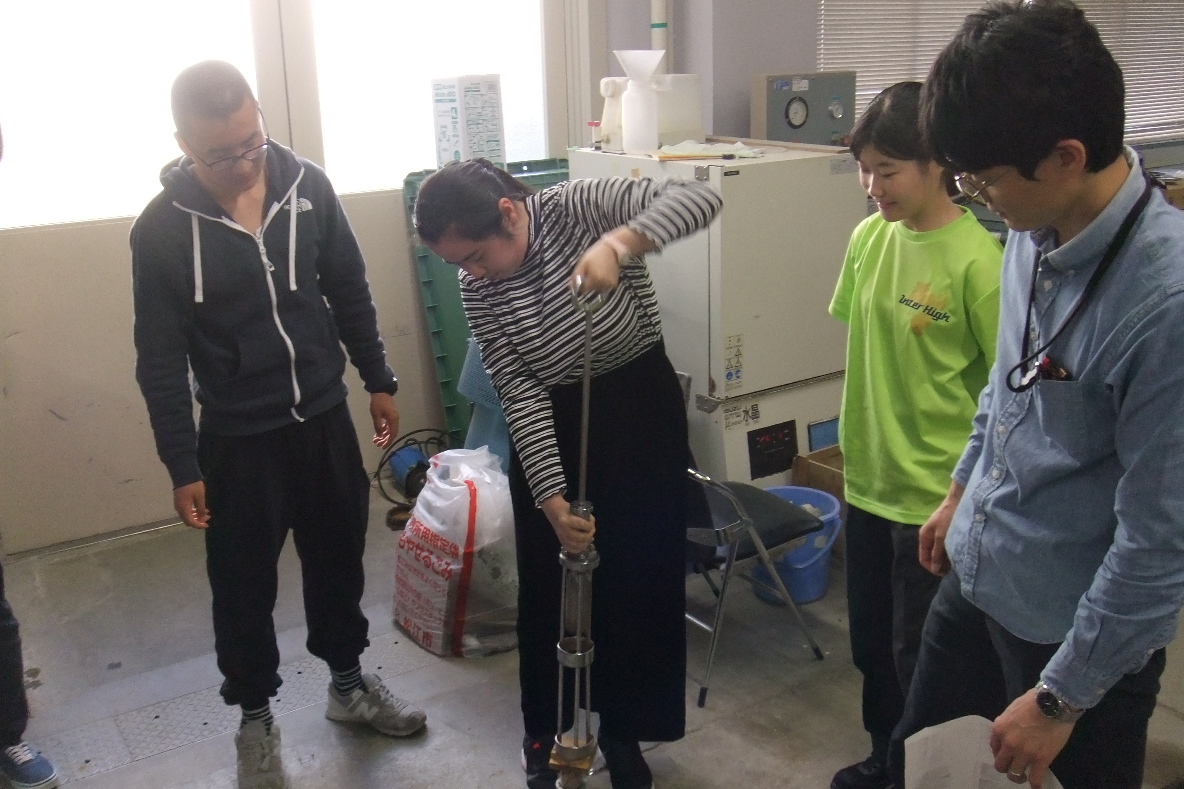 土質理工学実験室と土木材料学実験室に分かれて、水が透過する時間を計測して土の透水性を測定するとともに、土壌サンプルを用いて土壌の強度測定について体験しました。