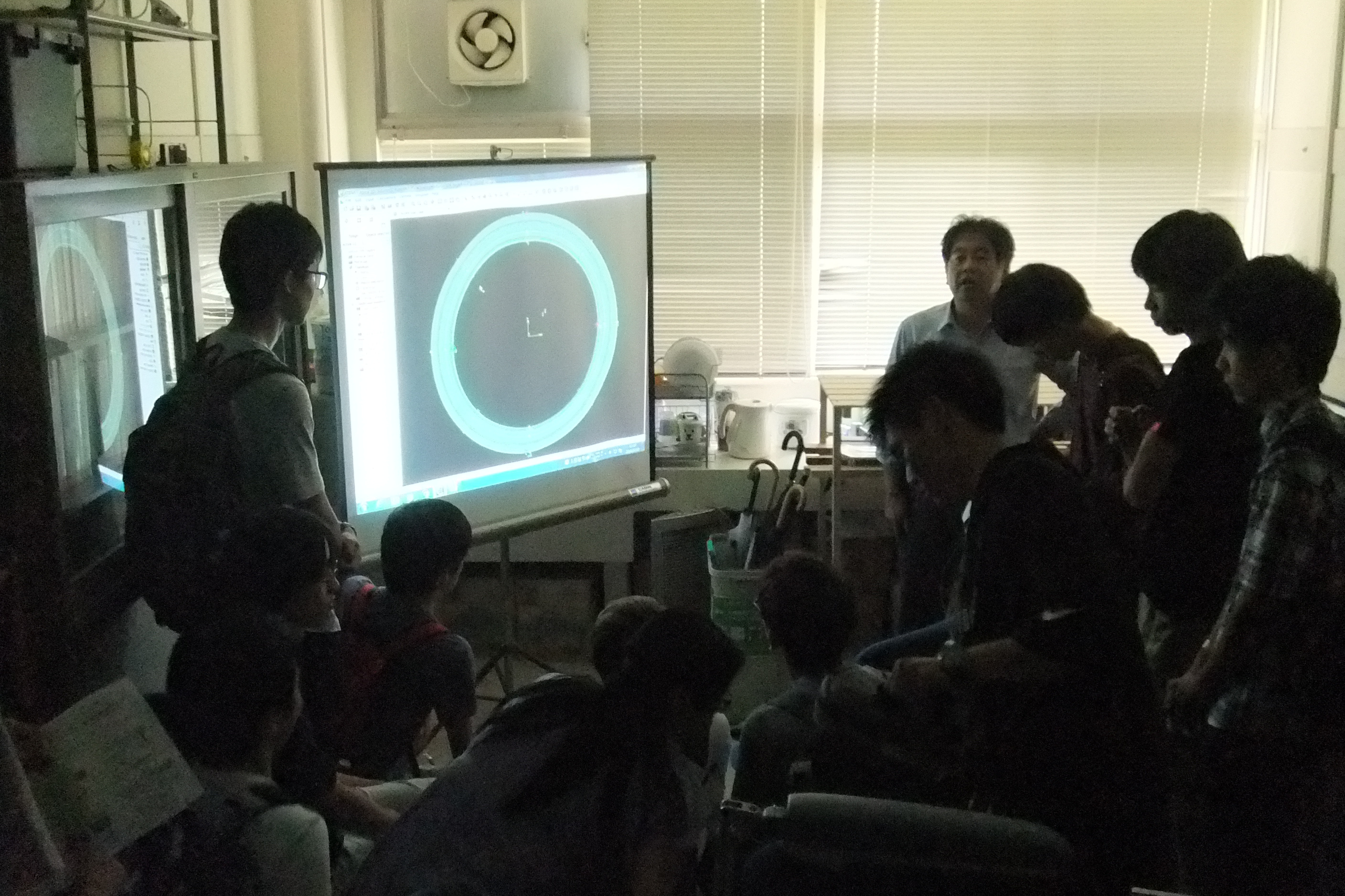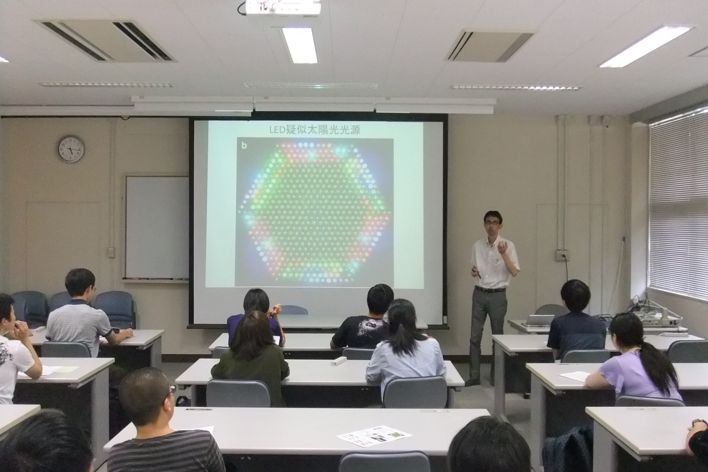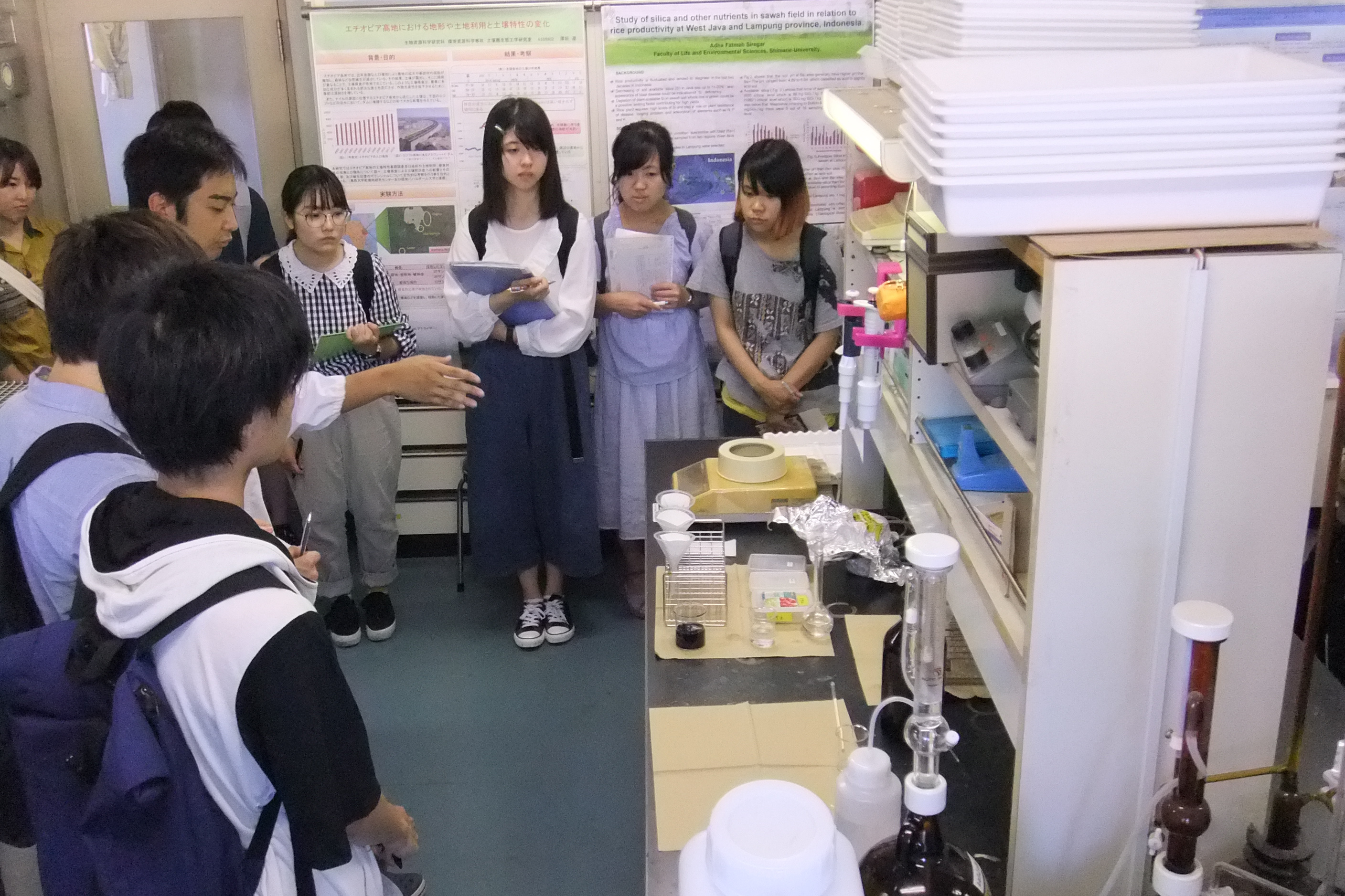 1回目は、4つのグループに分かれて、地域基盤系研究室、農地保全系研究室、⽔質⽔⽂系研究室、栽培⼯学系研究室を訪問しました。鉄バクテリアや地下水、物理特性の試験、パイプの補修シミュレーション、疑似太陽LEDなどを実際に見学しました。