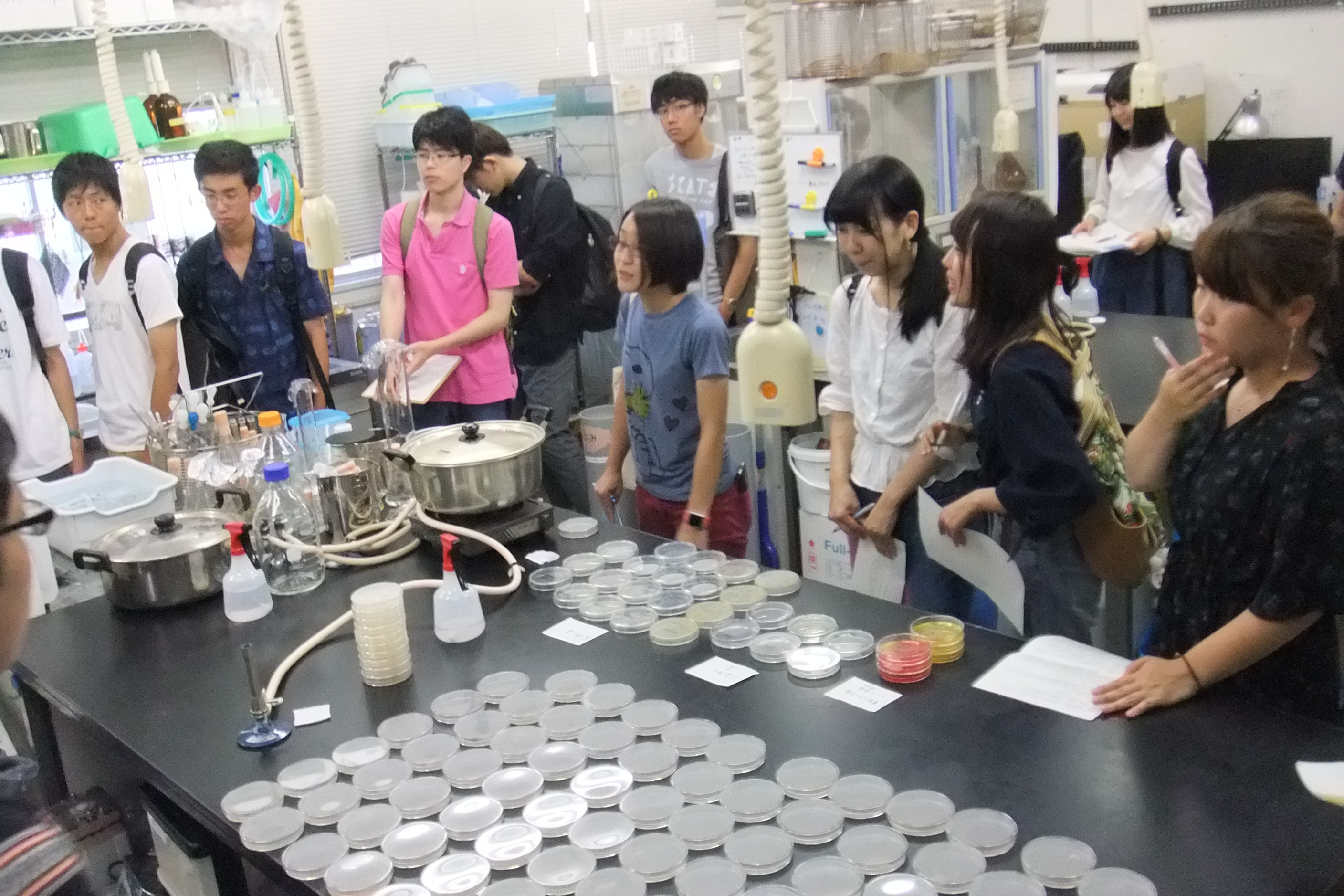 2回目は、4つのグループに分かれて、昆⾍⽣態学研究室、植物病理学研究室、微⽣物⽣態学研究室、森林⽣態環境学研究室を訪問しました。パネルやポスターによる研究紹介と各実験室の見学が行われました。