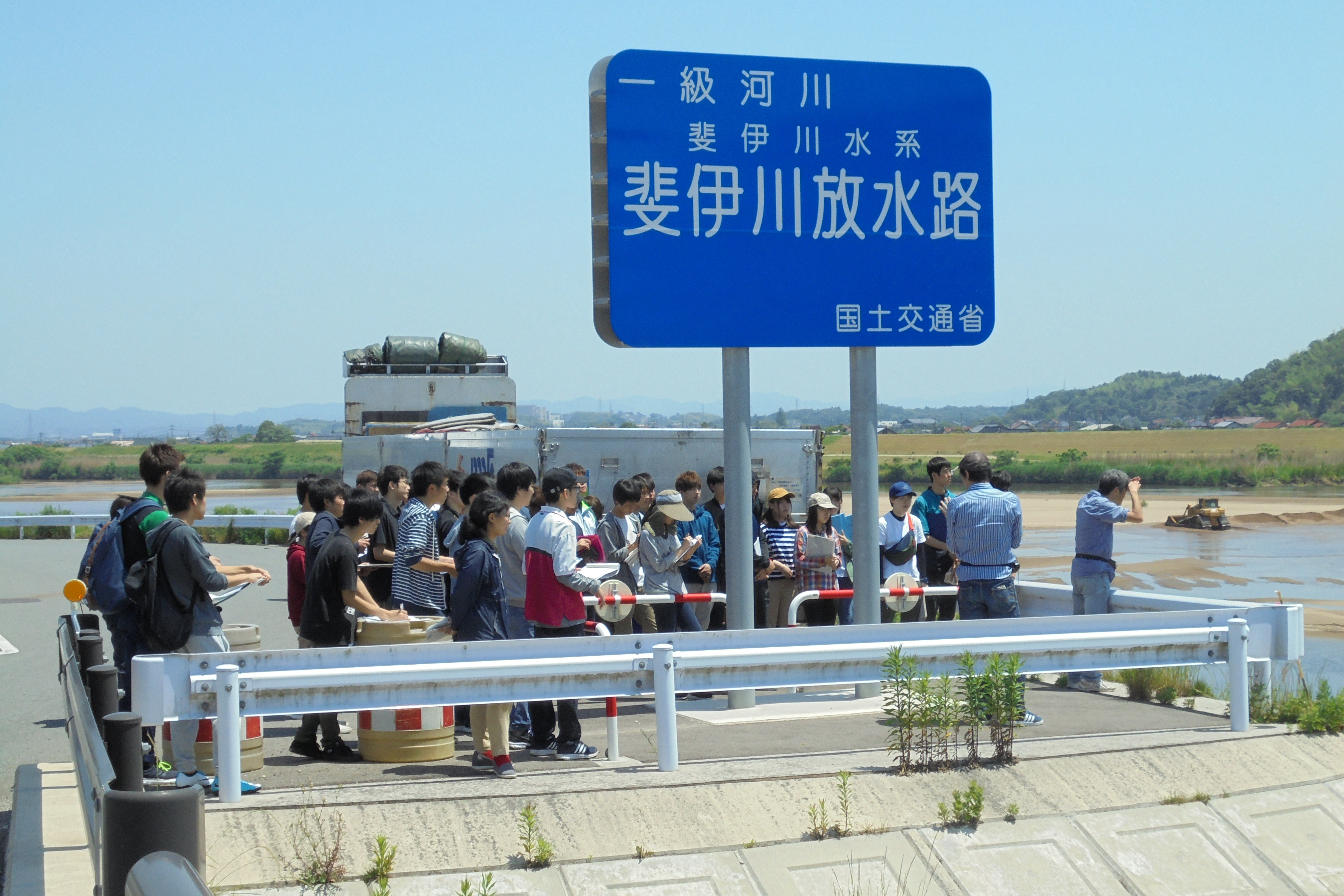 斐伊川治水の要衝のひとつ、斐伊川放水路の現地見学がありました。斐伊川洪水の分派機構、それを実現するための堰と水門の構造や操作について説明がありました。放水路内の土砂や植生などについての質問も出ました。