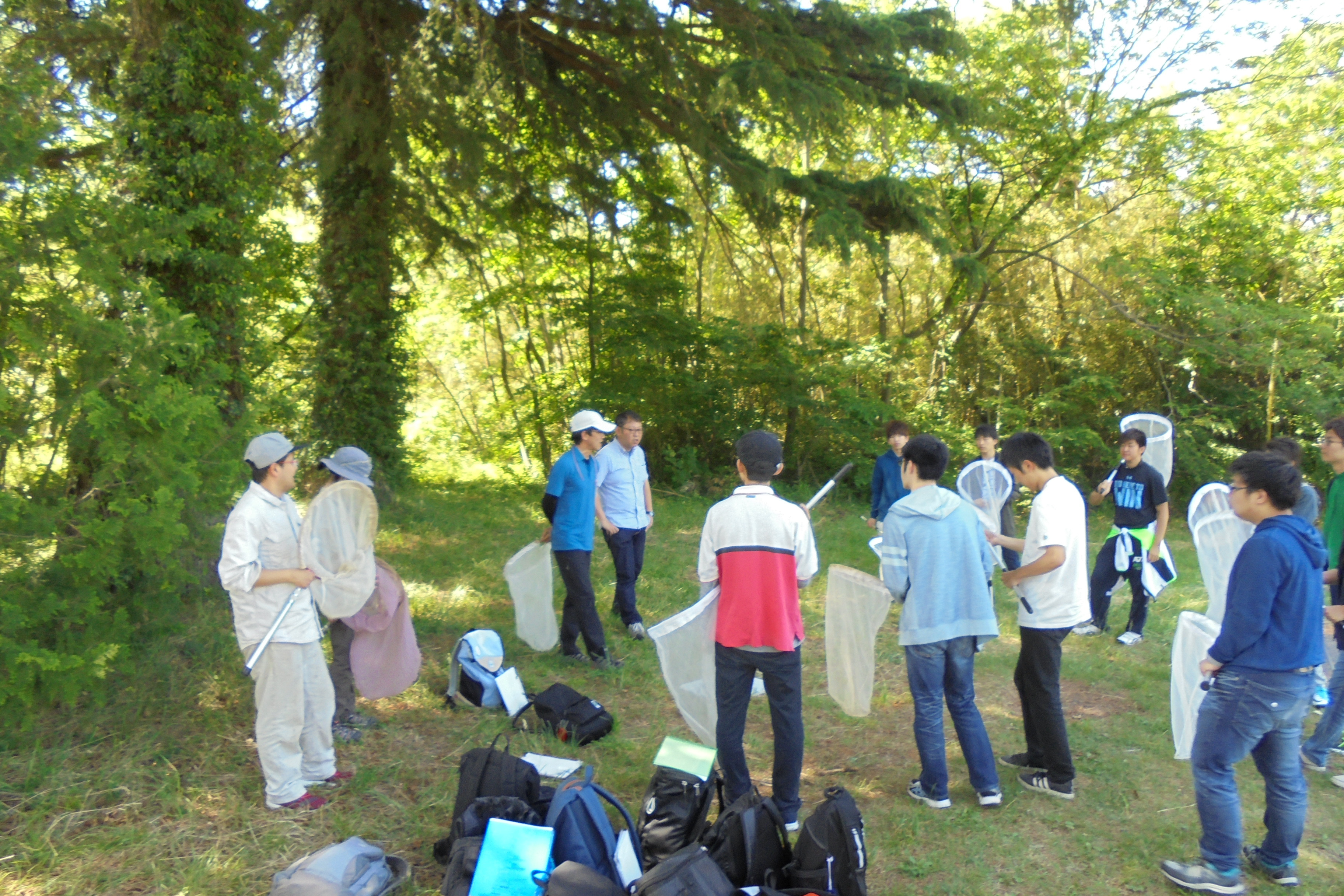 訪花中のハナバチ類を採集し、演習林周辺に生息するハナバチが利用する花資源として最も重要な植物種は何かを推定しました。実習中にハナバチの訪花が観察された植物には外来種も含まれていました。また、三瓶では法面緑化のために導入された外来種へのハナバチの訪花も観察されています。これらのことから、「環境」に関わる問題に取り組む際に考慮する必要がある生物間ネットワークの複雑さについて考えました。