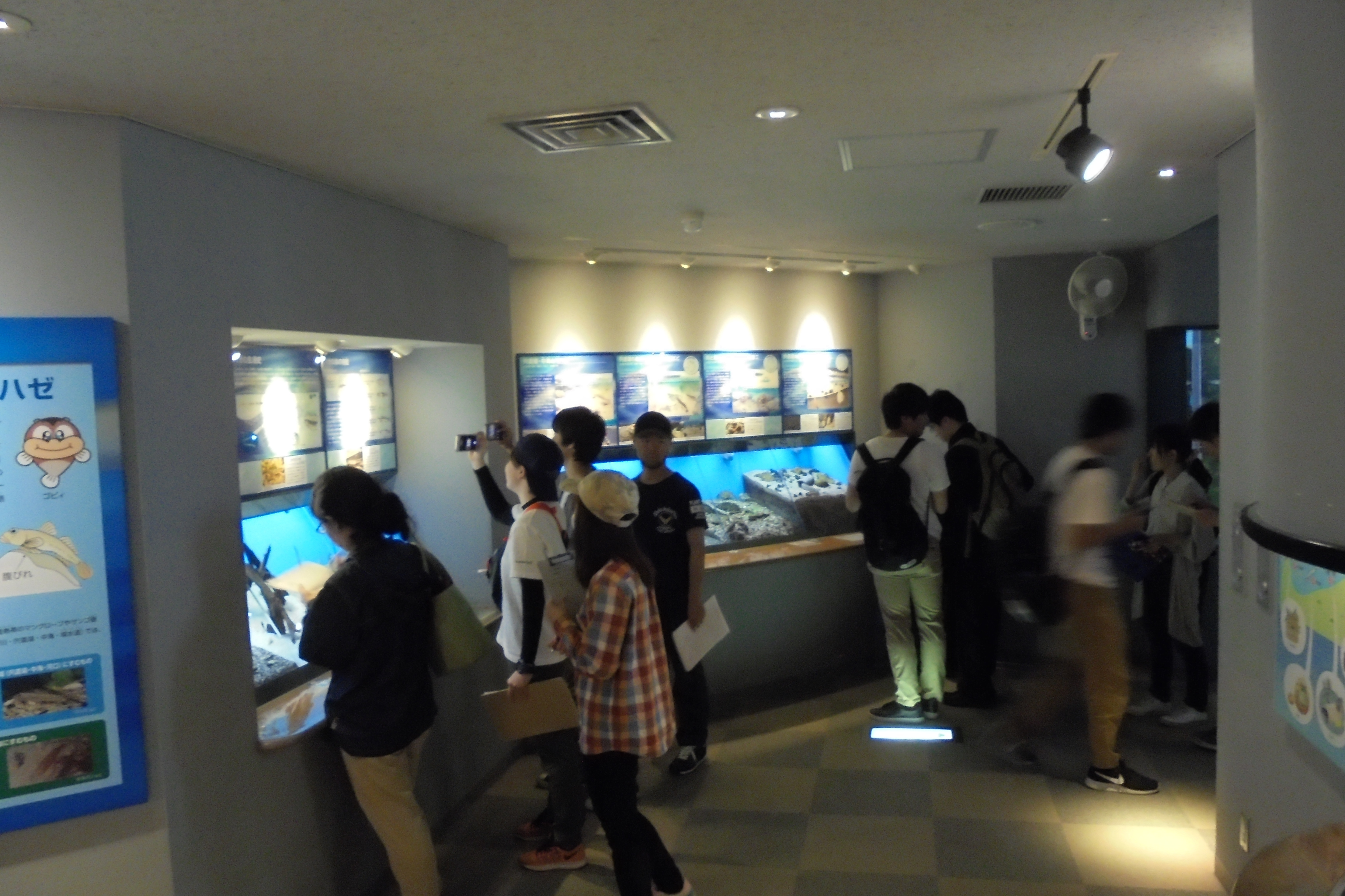 隣接する宍道湖自然館ゴビウスを見学しました。ここには、大学近くの汽水湖(宍道湖・中海)や島根の河川に生息する水生生物が展示されています。チェックシートを手にそれぞれが考えながら、水域環境と生物の特徴について学びました。